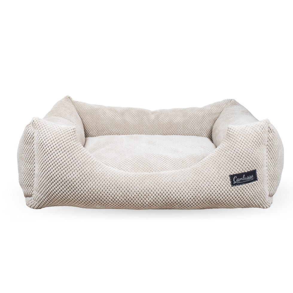 Ręcznie szyte legowisko w kolorze ecru spełni wymagania nawet najbardziej bezkompromisowych psiaków. Poliestrowa tkanina użyta w produkcji posłania jest niebywale miękka i przyjemna w dotyku. Wysoka gramatura sprawia, że nawet po kilkukrotnym praniu leżanka nie rozciąga się ani nie mechaci. Wnętrze poduszki wypełnia wysokojakościowa kulka silikonowa – delikatny puch dostosowany nawet do uczulonych psiaków. Spód posłania podszyty jest wodoodporną kodurą, która zabezpiecza materiał przed uszkodzeniem.  Wytłaczany materiał nie magazynuje zabrudzeń i nie przeciera się pod wpływem pazurków. Całość dopełniają dopasowane poduszeczki dołączone do każdego zestawu.