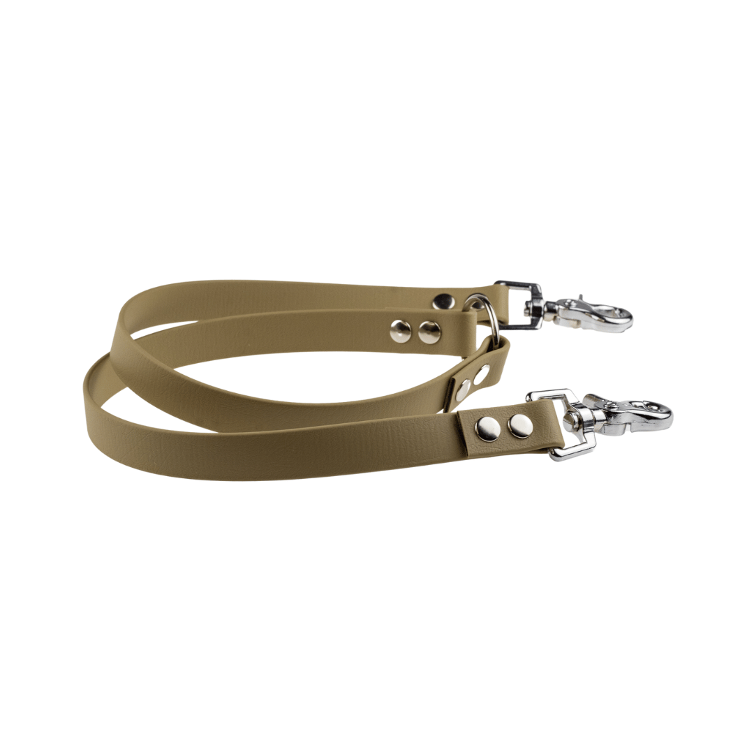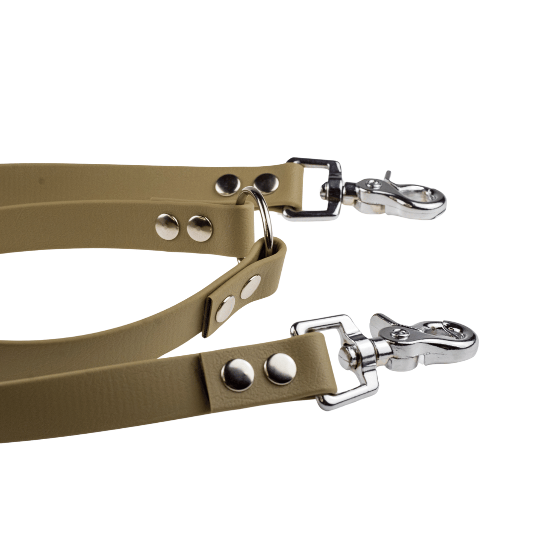 Dwójnik w kolorze khaki dla psa wykonana z oryginalnego materiału BioThane, którego właściwości sprawiają, że nadaje się do ekstremalnych zadań a jednocześnie wygląda bardzo elegancko. Materiał wytrzymuje setki kilogramów obciążenia.  Taśmy BioThane nie absorbują zapachów, uniemożliwiają rozwój pleśni i grzybów, są wodoodporne i bardzo łatwe w czyszczeniu. Miękki i elastyczny materiał nie zmienia swoich właściwości co ma miejsce w tanich taśmach PVC. Silikonowe emblematy z logiem marki i nazwą linii, to podkreślenie wyjątkowości produktu