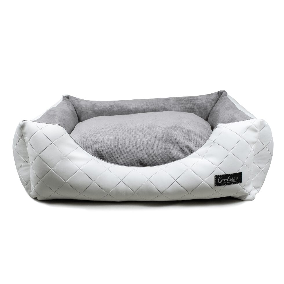 Ręcznie szyte, biało-srebrne posłanie linii Elegant PLUS to stylowe dopełnienie aranżacji wnętrza przy jednoczesnym spełnianiu wszystkich potrzeb wymagającego pupila. Wnętrze poduszki do spania wykonane jest w całości z antyalergicznej kulki silikonowej, która zadba o delikatną skórę ukochanych psiaków. Obszycie wewnętrznej części to wysokogatunkowy DOT o gramaturze rzędu 420 g. Materiał ten jest bardzo miły w dotyku, odporny na uszkodzenia mechaniczne – przetarcia czy odkształcenia i znalazł szerokie zastosowanie w tapicerstwie (wykończenie sof, łóżek, kanap). Zewnętrzna część wykończona jest z pikowanej ekoskóry w kolorze białym charakteryzującej się pięknym i eleganckim wyglądem. Jest to odporny na ścieranie, rozrywanie czy zaginanie materiał. Dodatkowo bardzo łatwy w czyszczeniu, wilgotna szmatka w zupełności wystarczy aby usunąć większość zabrudzeń. Wewnętrzna strona wykonana z flizeliny nie traci swoich właściwości. Spód legowiska to wodoodporna kodura. Całość dopełniają urocze poduszeczki dołączone do każdego legowiska Canlusso.