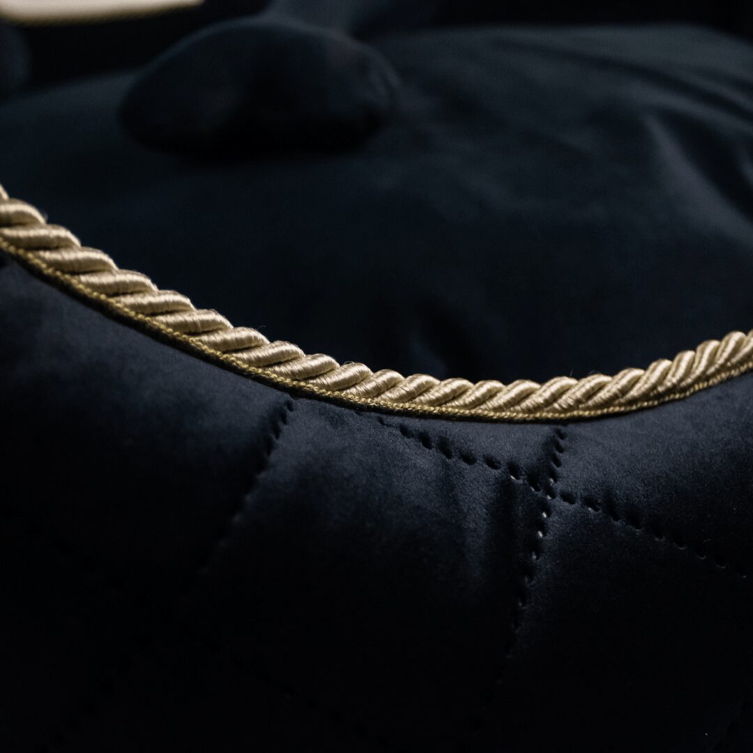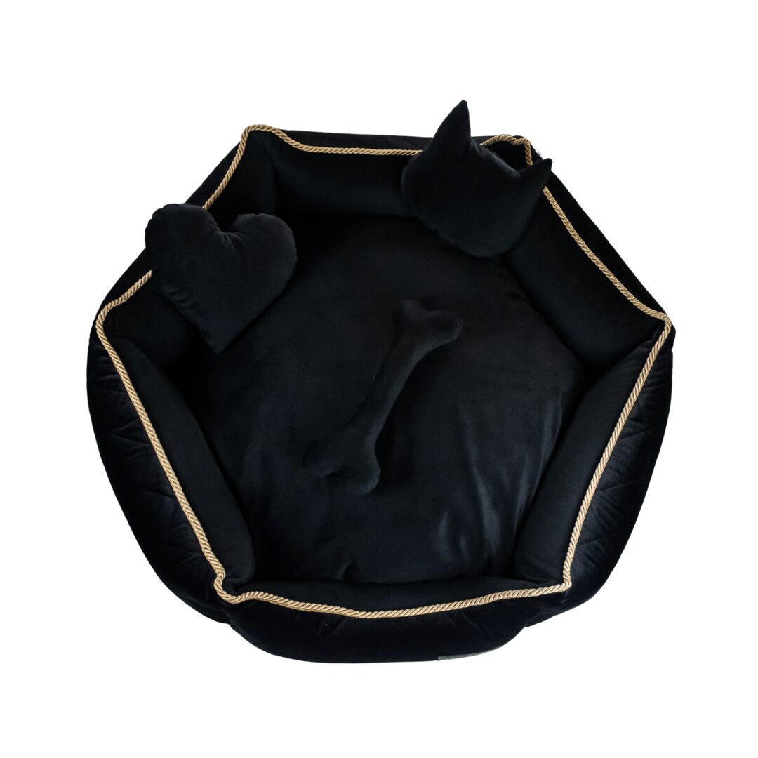 Ręcznie szyte, sześciokątne legowisko w kolorze czarnym to jednocześnie stylowe i funkcjonalne rozwiązanie. Obszycie wykonane z poliestrowego materiału charakteryzuje się lekko wyczuwalną, aksamitną strukturą, która świetnie sprawdzi się zarówno u większych, jak i u mniejszych psiaków. Wysoka gramatura weluru gładkiego i pikowanego sprawia natomiast, że posłanie jest wytrzymałe na wszelkie uszkodzenia mechaniczne. Wnętrze legowiska wypełnia antyalergiczna puch w postaci kulki silikonowej. Leżanka Royal jest miękka, łatwa w utrzymaniu, a boki nie odkształcają się nawet po kilkukrotnym czyszczeniu. Całość idealnie dopełnia zestaw akcesoriów dołączonych do każdego legowiska Canlusso.