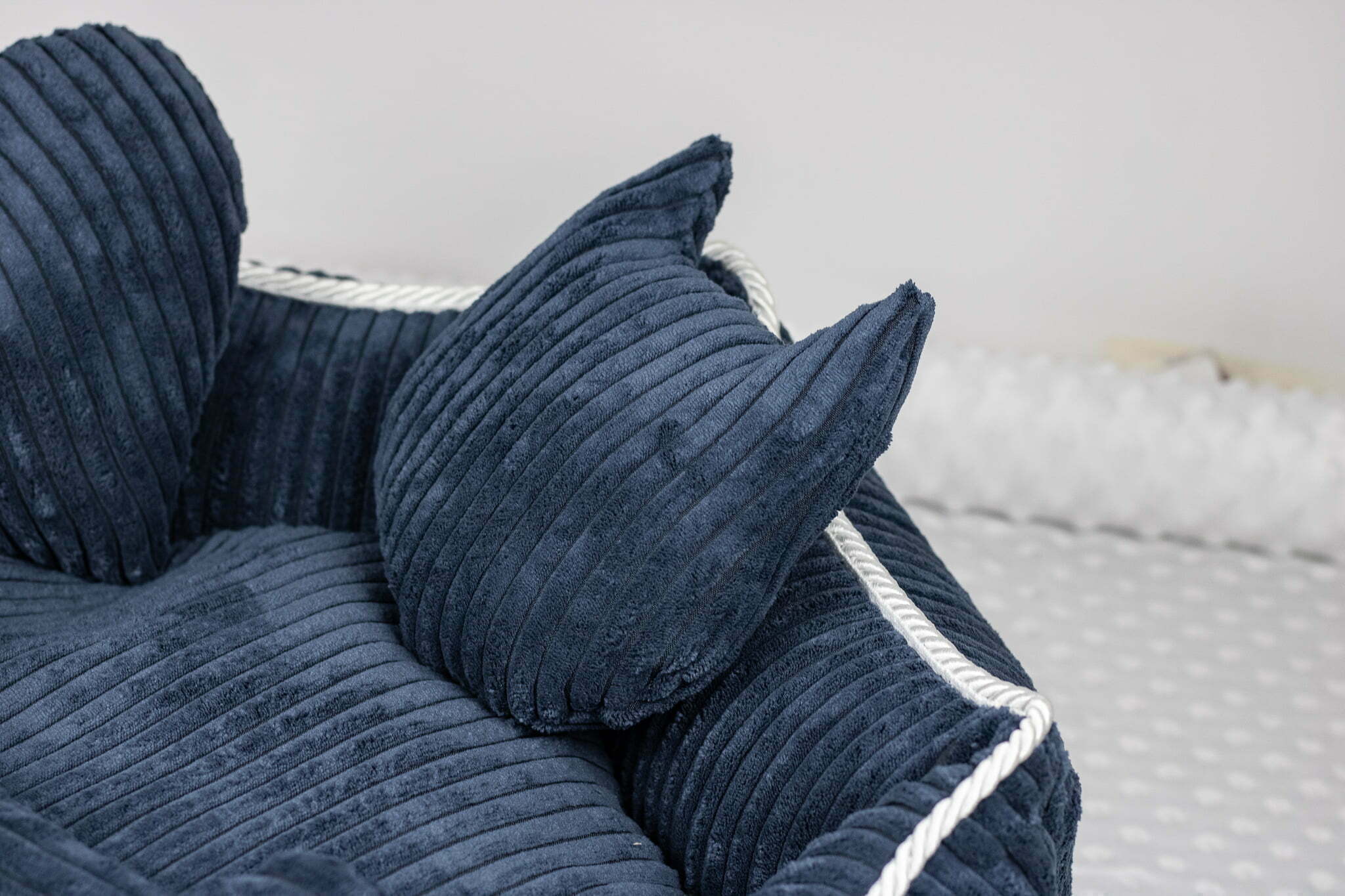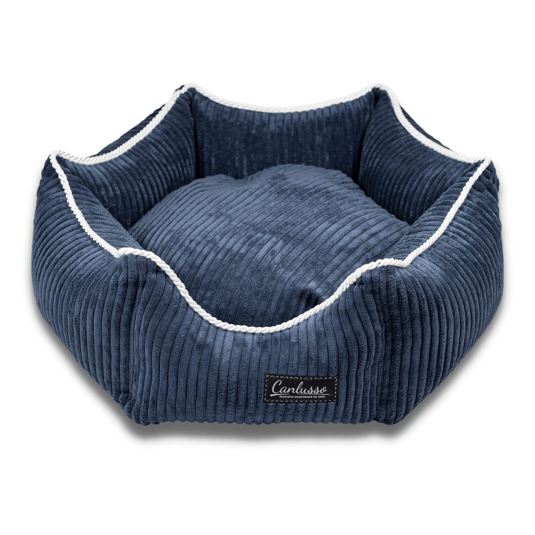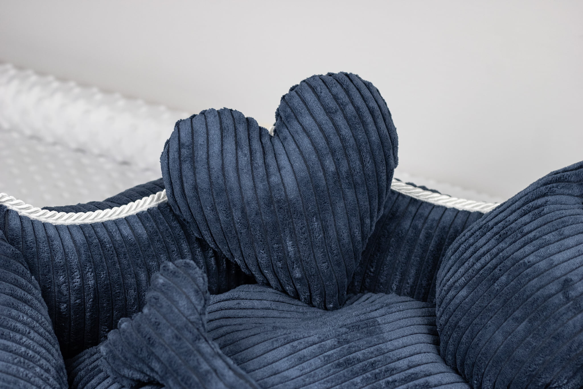 Ręcznie szyte, granatowe legowisko z linii Earth, to połączenie eleganckiego wyglądu z najlepszymi cechami, idealnego posłania dla psa. Tkanina, która została użyta do jego uszycia, to wysokiej klasy materiał tapicerski typu SOFT TOUCH. Jego niezwykłą miękkość zapewnia długi włos o szerokości około 10 mm. Materiał pomimo swojej delikatności jest niezwykle wytrzymały ( ścieralność do 100 tysięcy cykli) i odporny na wchłanianie wody. Wypełnienie poduszki oraz boków to kulka silikonowa – materiał hipoalergiczny. Dzięki zastosowaniu systemu zamków, każdy element legowiska ma ściągany pokrowiec – który można wyprać w pralce w temperaturze 30 stopni. Całość dopełniają urocze poduszeczki w 3 kształtach, dołączone do każdego legowiska Canlusso. Produkt spełnia wszystkie potrzeby nawet najbardziej wybrednych psów, jednocześnie ciesząc oko ich opiekunów.