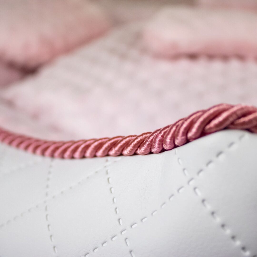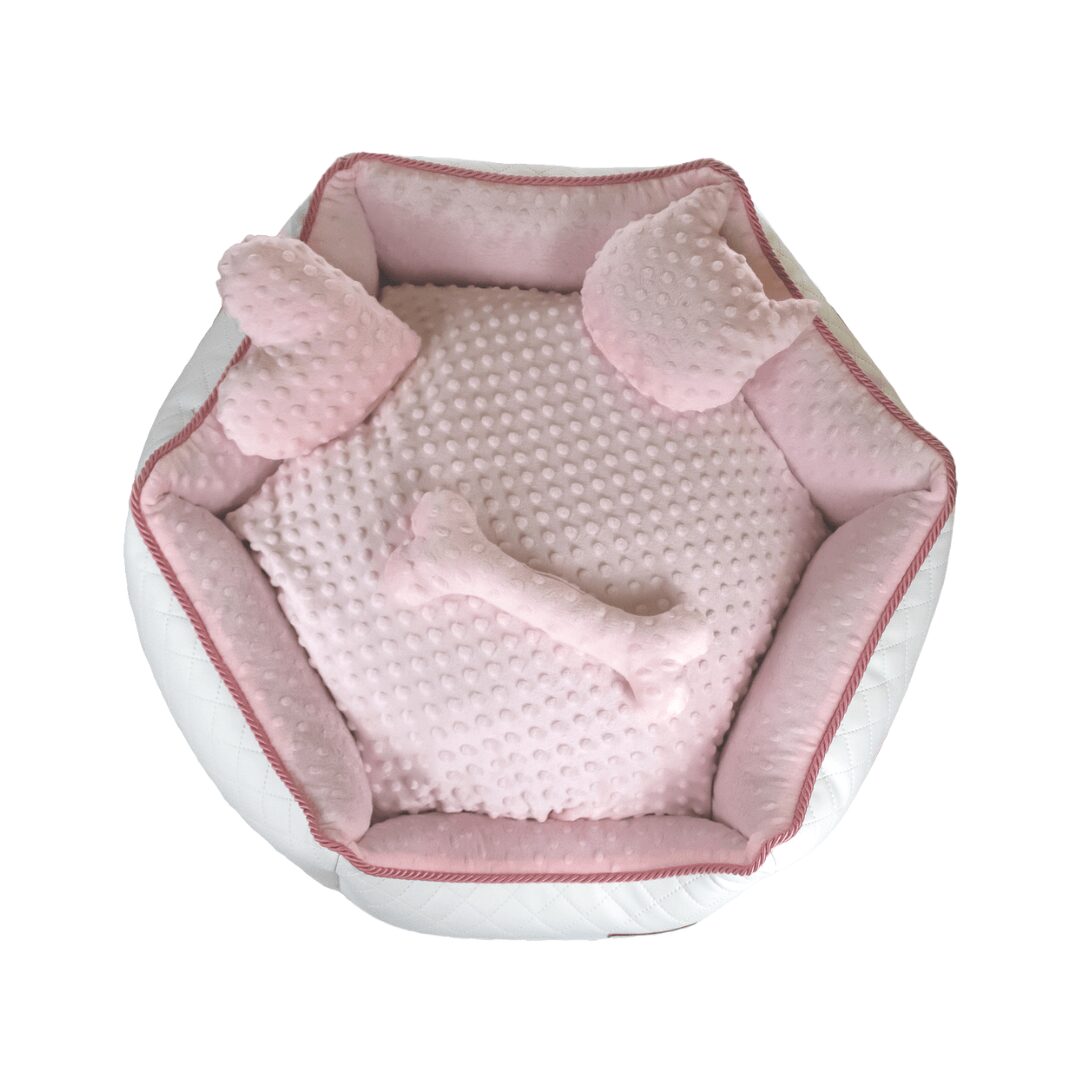 Biało – różowe, sześciokątne legowisko linii Royal spełni wymagania nawet najbardziej bezkompromisowego psiaka. Poliestrowa tkanina użyta w produkcji posłania jest delikatna i absolutnie bezpieczna dla skóry czworonogów. Solidne minky i eko skóra charakteryzują się odpornością na wszelkie uszkodzenia mechaniczne, a dzięki dolnemu wzmocnieniu materiał jest przystosowany do prania w pralce nawet w wyższej temperaturze. Wnętrze poduszki, ręcznie wykonanego posłania wypełnia antyalergiczny, sztuczny puch zwany potocznie kulką silikonową. Delikatna, aksamitna struktura legowiska sprawdzi się świetnie również u najdelikatniejszych i chorowitych zwierzaków. Całość idealnie dopełnia stylowe, solidne obszycie na całym obwodzie. Zestaw świetnie komponuje się z akcesoriami dołączonymi do każdego zestawu.