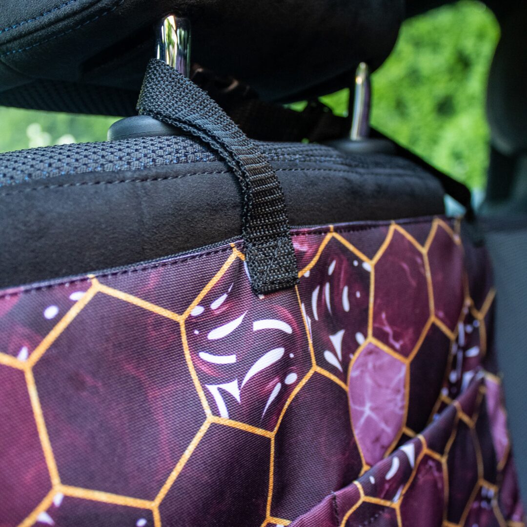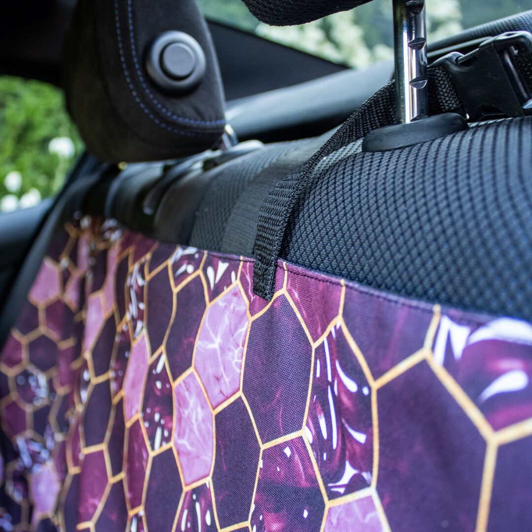 Mata do samochodu Canlusso to ręcznie szyty produkt, służący do ochrony całej tylnej kanapy i bezpiecznego przewożenia dużych psów. Materiały z jakich została wykonana to najwyższej jakości tkanina oxford z motywem kształtu heksagon, czarna, wodoodporna tkanina SUN PRO (często używana w produkcji mebli ogrodowych) oraz wzmocnione podszycie za pomocą kodury. Mata posiada system zamków, które po zasunięciu Tworzą swego rodzaju kojec. W przedniej części znajduje się siatka przez, którą piesek cały czas może obserwować pozostałe osoby w pojeździe, przez co uniknie stresu. Mata posiada otwory, dzięki, którym pupil za pomocą specjalnej uprzęży może zostać przypięty do wtyczki pasów bezpieczeństwa. Na uwagę zasługuję poręczna kieszeń, do której można schować akcesoria do zabawy, smycz lub przekąski. Cała mata ze względu na swoje właściwości hydrofobowe jest bardzo łatwa w czyszczeniu – wystarczy spłukać brud pod bieżącą wodą.