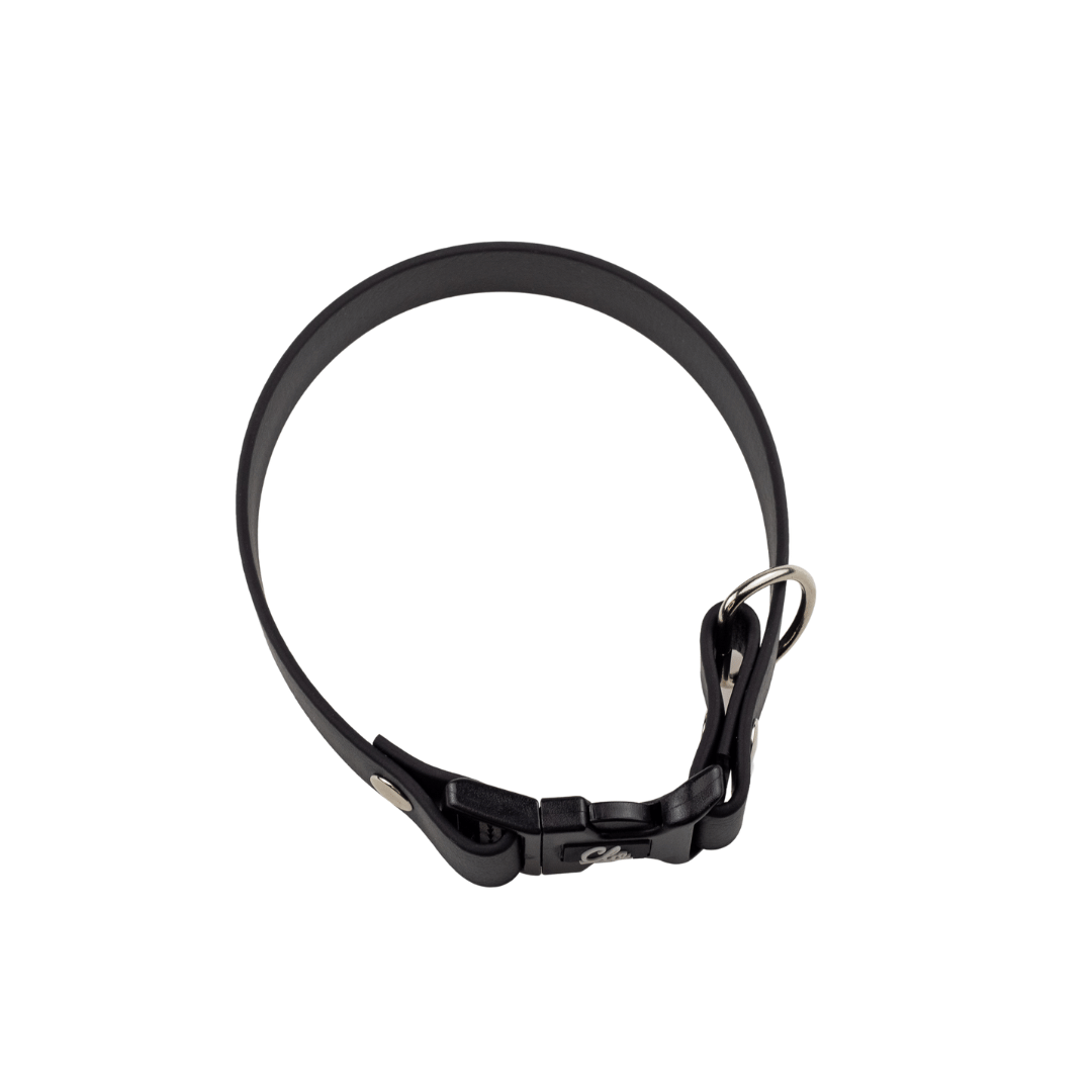 Czarna obroża dla psa na wymiar wykonana z oryginalnego materiału BioThane, którego właściwości sprawiają, że nadaje się do ekstremalnych zadań a jednocześnie wygląda bardzo elegancko. Materiał wytrzymuje setki kilogramów obciążenia. Taśmy BioThane nie absorbują zapachów, uniemożliwiają rozwój pleśni i grzybów, są wodoodporne i bardzo łatwe w czyszczeniu. Miękki i elastyczny materiał nie zmienia swoich właściwości co ma miejsce w tanich taśmach PVC. Silikonowe emblematy z logiem marki i nazwą linii, to podkreślenie wyjątkowości produktu