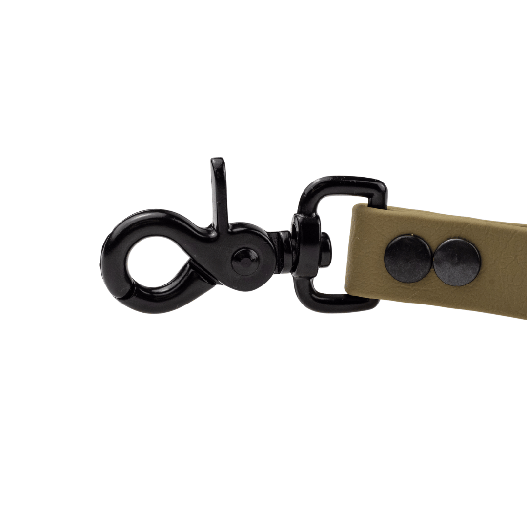 Rączka w kolorze khaki wykonana z oryginalnego materiału BioThane, którego właściwości sprawiają, że nadaje się do ekstremalnych zadań a jednocześnie wygląda bardzo elegancko. Materiał wytrzymuje setki kilogramów obciążenia. Taśmy BioThane nie absorbują zapachów, uniemożliwiają rozwój pleśni i grzybów, są wodoodporne i bardzo łatwe w czyszczeniu. Miękki i elastyczny materiał nie zmienia swoich właściwości co ma miejsce w tanich taśmach PVC. Silikonowe emblematy z logiem marki i nazwą linii, to podkreślenie wyjątkowości produktu