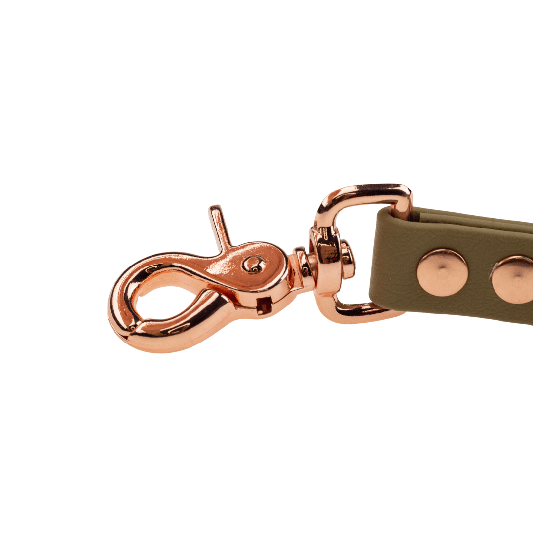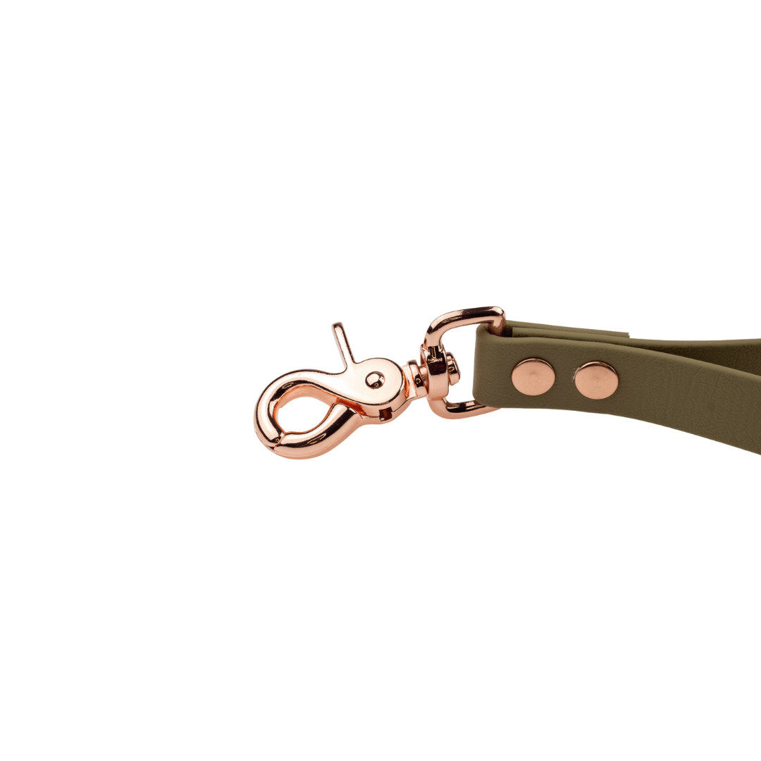 Rączka w kolorze khaki wykonana z oryginalnego materiału BioThane, którego właściwości sprawiają, że nadaje się do ekstremalnych zadań a jednocześnie wygląda bardzo elegancko. Materiał wytrzymuje setki kilogramów obciążenia. Taśmy BioThane nie absorbują zapachów, uniemożliwiają rozwój pleśni i grzybów, są wodoodporne i bardzo łatwe w czyszczeniu. Miękki i elastyczny materiał nie zmienia swoich właściwości co ma miejsce w tanich taśmach PVC. Silikonowe emblematy z logiem marki i nazwą linii, to podkreślenie wyjątkowości produktu