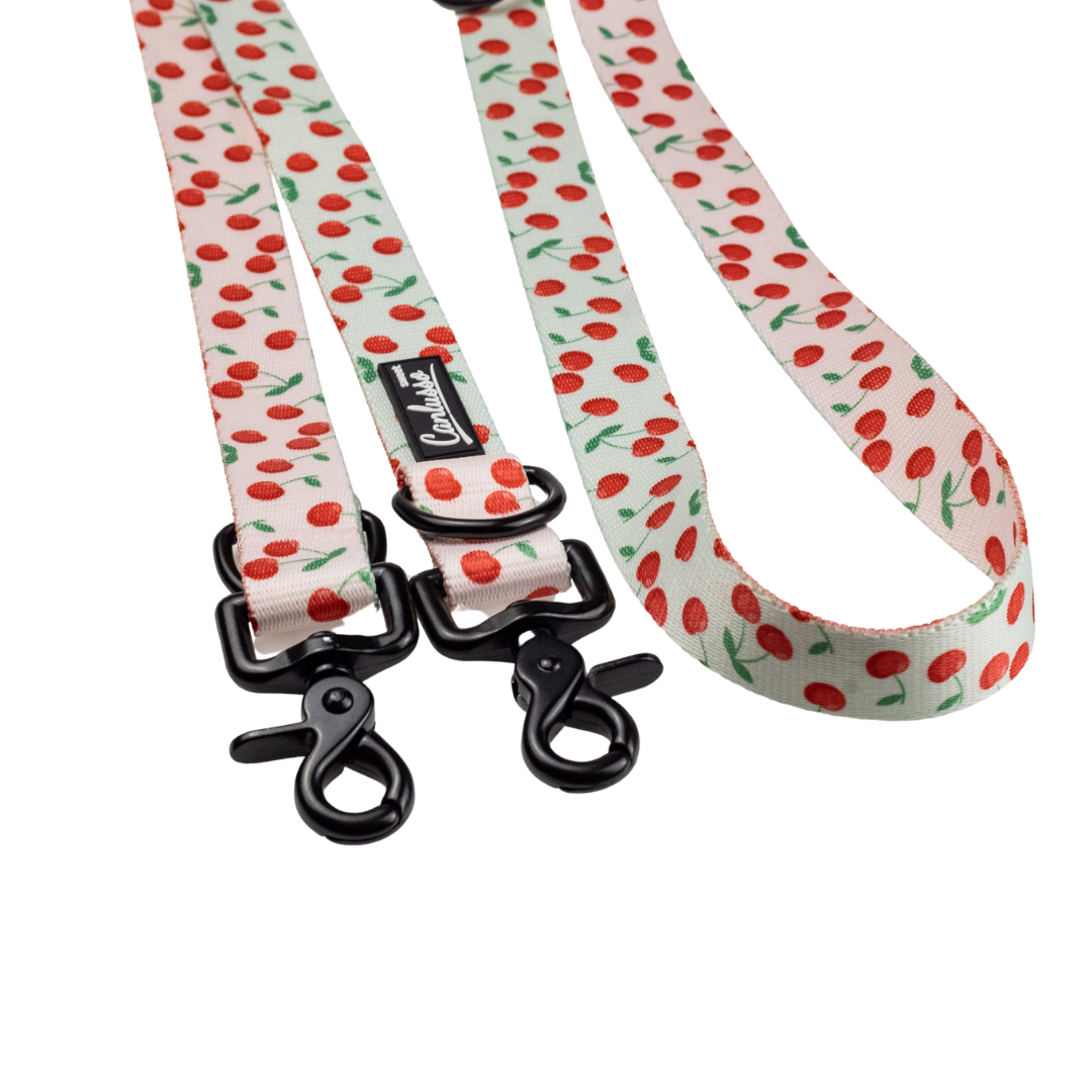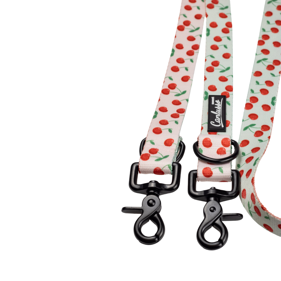 Smycz przepinana dla psa Cherry, to ręcznie szyty produkt, który łączy ze sobą funkcjonalność oraz design. Dzięki zastosowaniu miękkiej taśmy nośnej premium, osiągnięto wyrazisty i kolorowy nadruk. Dwa bardzo wytrzymałe karabińczyki spustowe, pozwalają na regulację długości smyczy oraz możliwość przepięcia jej przez ramię i prowadzenie psa bez użycia rąk. Szwy typu zygzak, to gwarancja wytrzymałości a duży karabińczyk spustowy, sprawia, że pies jest pod kontrolą w każdej sytuacji. Silikonowe logo z nazwą linii podkreśla wyjątkowość produktu.