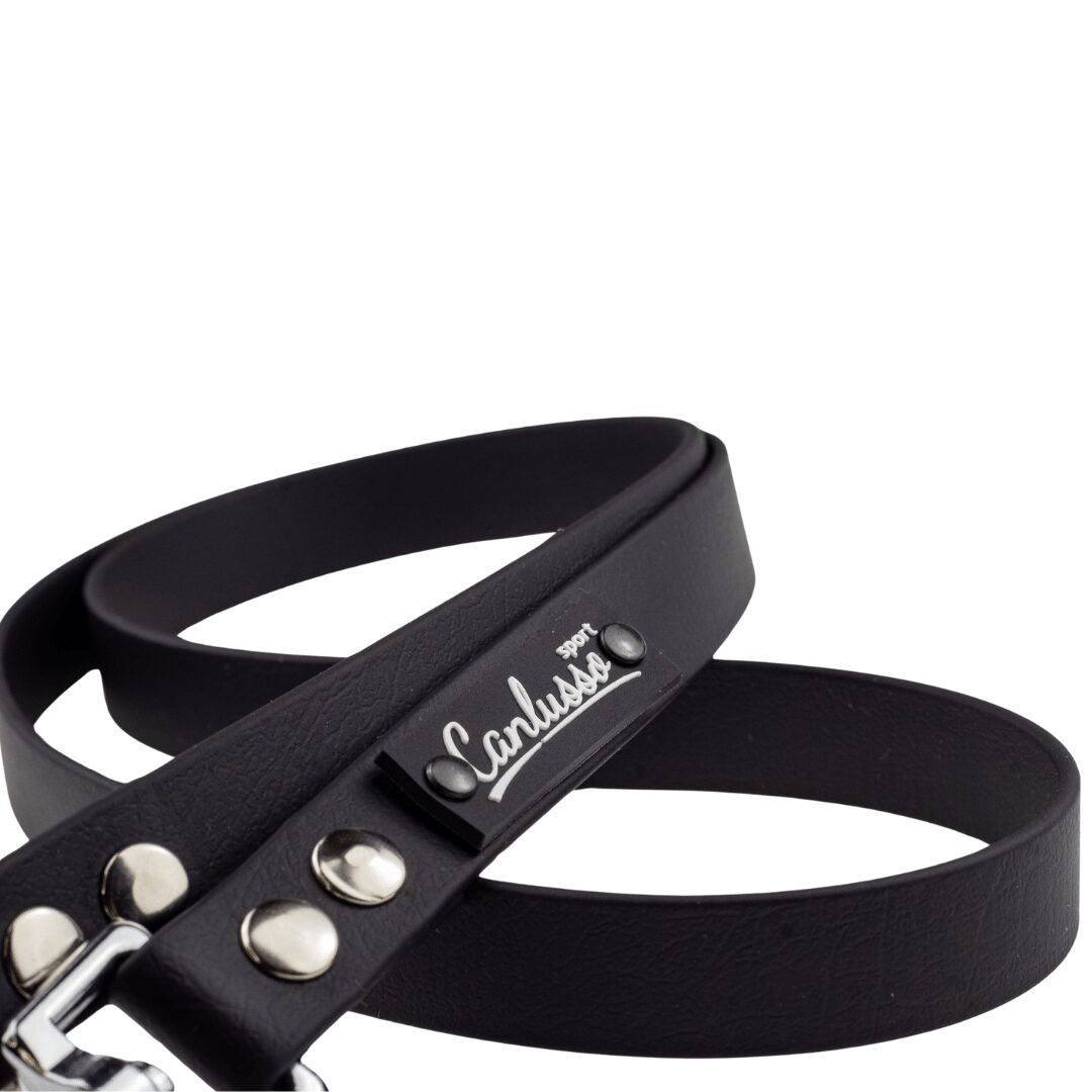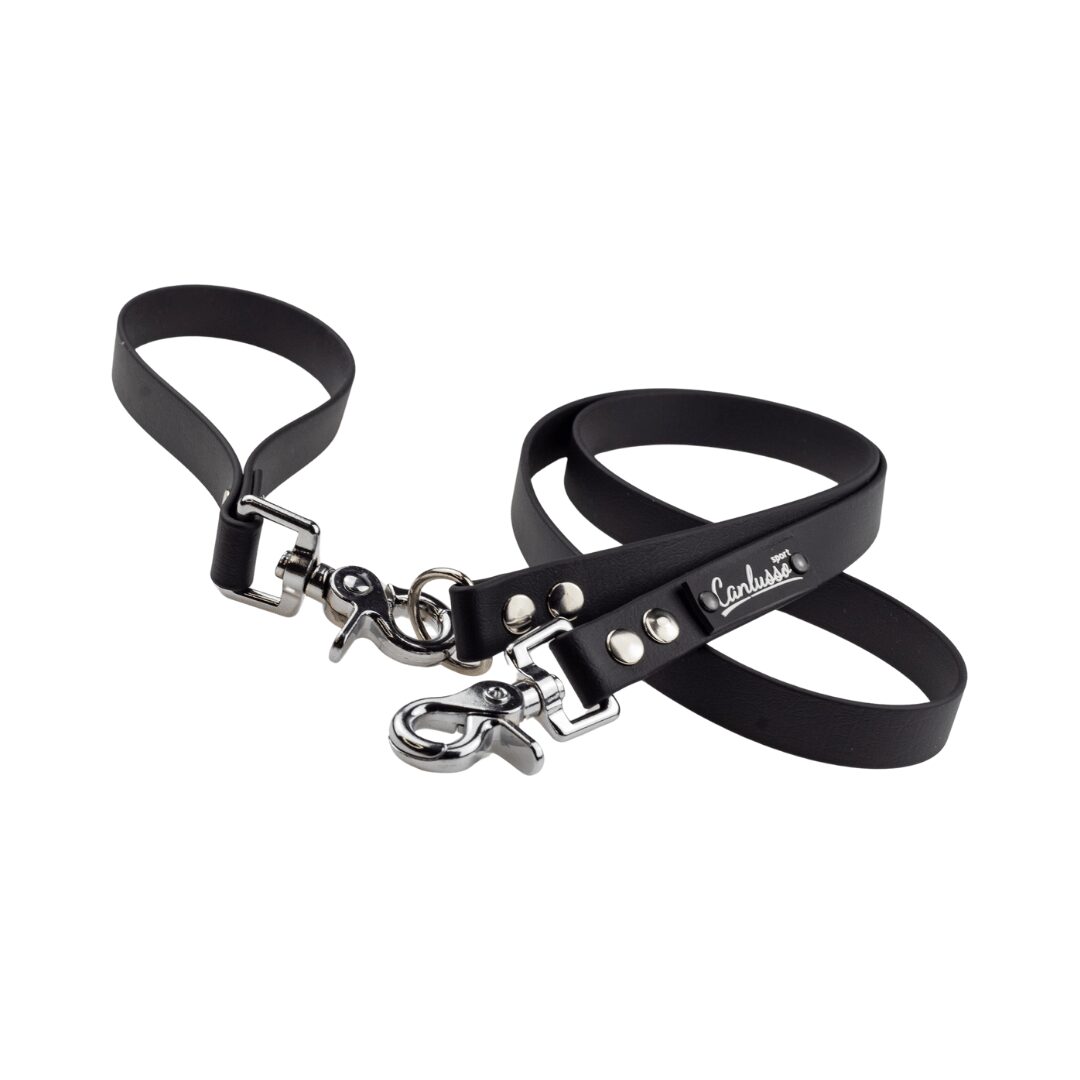 Czarna smycz dla psa, wykonana z oryginalnego materiału BioThane, to produkt nadający się do ekstremalnych zadań, jednocześnie wyglądają bardzo elegancko. Materiał wytrzymuje setki kilogramów obciążenia. Taśmy BioThane nie absorbują zapachów, uniemożliwiają rozwój pleśni i grzybów, są wodoodporne i bardzo łatwe w czyszczeniu. Miękki i elastyczny materiał nie zmienia swoich właściwości co ma miejsce w tanich taśmach PVC. Dodatkowe półkole pozwala na zawieszenie ekwipunku, najczęściej zabieranego na spacer. Duży, bardzo wytrzymały karabińczyk spustowy sprawia, że z smyczą Canlusso BioThane, pupil jest pod kontrolą w każdej sytuacji. Silikonowe logo z nazwą linii podkreśla wyjątkowość produktu.